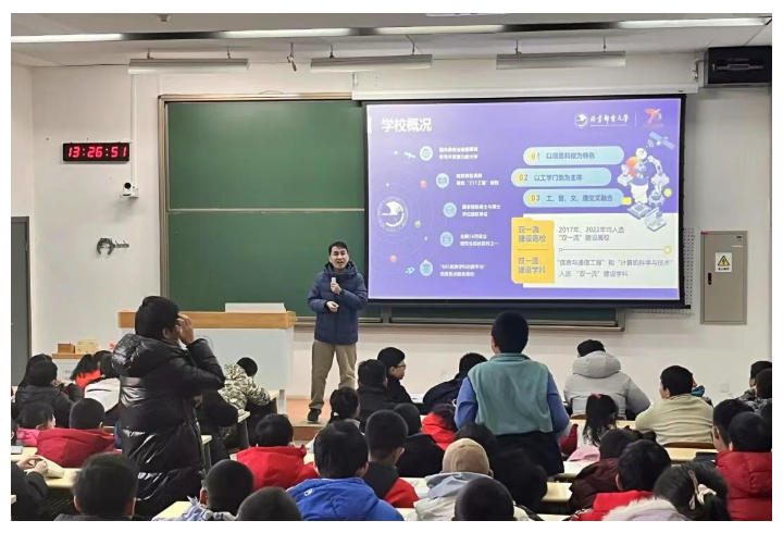 上午10:00,学员们集体乘坐大巴前往北京邮电大学沙河校区。午餐过后,北京邮电大学招生处副处长陈伟向全体学员致欢迎辞,并围绕北京邮电大学的发展历程展开详细介绍。重点阐述了学校在学科建设领域的核心优势与鲜明特色,系统解读了相关专业布局与发展成果,着重强调了学校专业设置对国家信息通信等关键领域发展的重要支撑作用与突出贡献。现场中小学生全程专注,眼神满是向往,不少同学深受触动,明晰了学习方向,立志深耕相关领域,以学识助力科技强国,为他们播下了逐梦的种子。