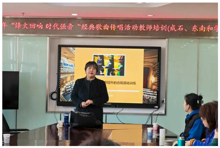 本次培训特邀李磊老师主讲。李磊老师为北京市朝阳区教师发展学院特级教师、正高级教师,同时担任朝阳教师合唱团团长,在合唱教学与团队指导领域经验丰富。培训中,李磊老师紧扣红歌传唱实际需求,围绕节奏把控、音准训练、合唱排练技术三大核心内容展开系统讲解。她结合经典课堂案例,拆解声部平衡、气息控制、情感表达等关键要点,用节奏训练、示范演唱、现场纠错、要点复盘等方式,把专业知识转化为可操作、可落地的教学方法,有效破解一线教师在合唱排练中的常见难题。