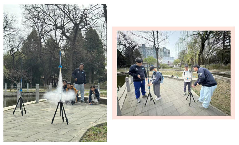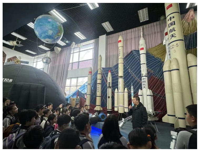 活动中,同学们在“飞天梦”项目团队教师的带领下,系统了解中国运载火箭发展历程与卫星轨道特点,在穹幕影院沉浸式领略四季星空的奇妙变幻,亲身体验航天员模拟训练设备。在动手实践环节,大家精心制作并成功发射“东风”1号模型,当模型腾空而起,现场掌声与欢呼声不断,同学们真切体会到航天发射的激动与自豪,感受航天人的责任与担当。