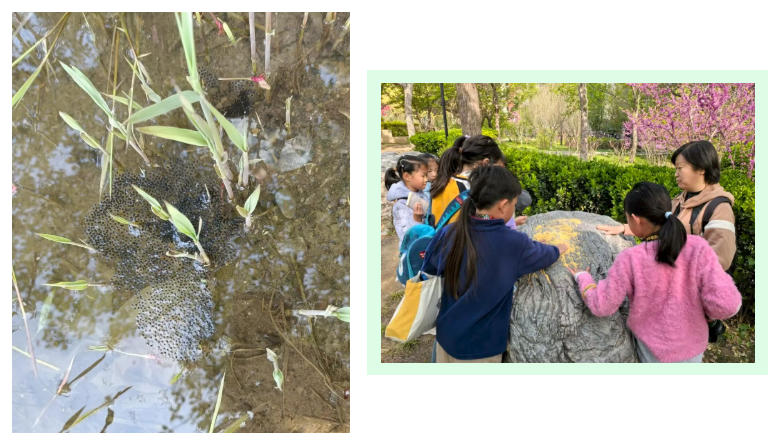 自然观察拓展、生态科普深入成为本次活动的鲜明亮点。实训途中,同学们在湿地水域细心观察到青蛙产卵的全过程,清晰见证生命孕育的奇妙瞬间,直观感受湿地生态的丰富多样。活动中,偶遇社区居民在林间投喂鸟类,老师们抓住这一真实场景,现场为同学们讲解不当投喂对鸟类健康、觅食本能及生态平衡的危害,引导大家树立科学护鸟、文明观鸟的正确理念。同学们认真聆听、主动提问,在真实情境中深化对生态保护的认知,进一步增强了尊重自然、顺应自然的环保意识。