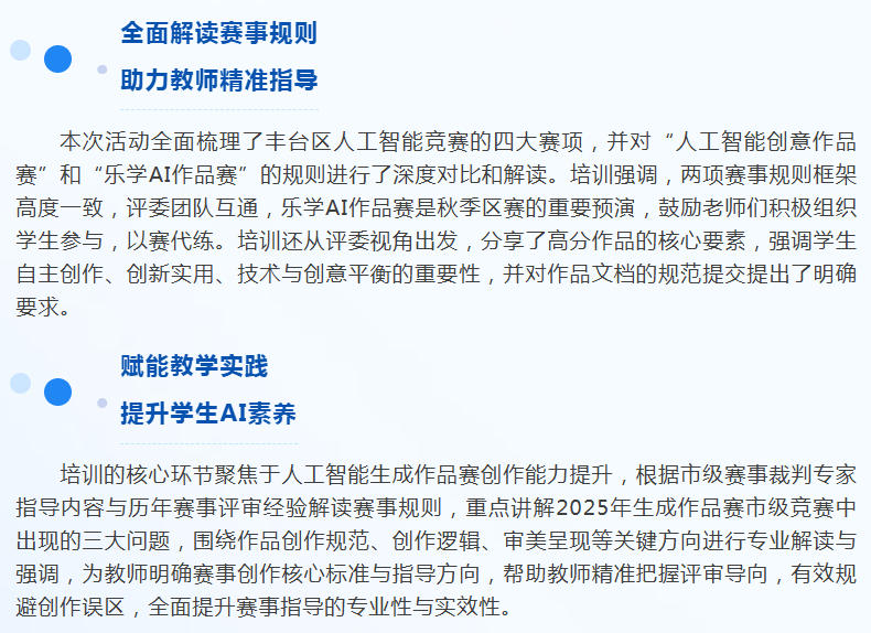 参训老师们不仅深入理解了各项赛事的规则和评审标准,更掌握了生成作品赛的高效创作方法、迭代流程,提升了作品指导与生成式AI创作技能。培训针对新增的“乐学AI创意作品竞赛”和备受关注的“人工智能生成作品赛”进行深度解析,为教师们今后的竞赛指导工作指明了方向。本次培训内容详实,既有理论高度,又有实践深度。通过本次培训,大家纷纷表示,将把培训所学应用到实际教学和指导中,引导学生在竞赛中真正提升人工智能素养与实践能力,在2026年北京市中小学生人工智能竞赛、2026 年丰台区青少年乐学科技实践活动 —— 乐学AI创意作品竞赛中创作出更多优秀的作品。