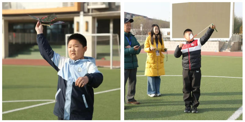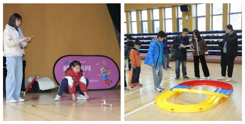 赛场上,兴奋与专注交织成独特的画面。选手们小心翼翼地转动螺旋桨,将橡筋拧至最佳松紧度,出手后,大家纷纷仰头追踪。今年四驱车赛道旁更是热闹非凡,参与度与比赛成绩均有大幅度提升。